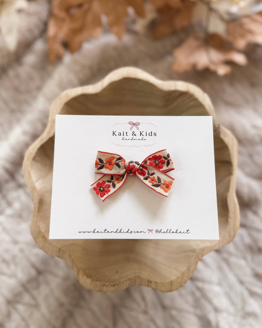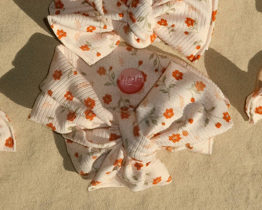 Oversized Bow Cream and Orange Floral Ribbed Tie On Headwrap