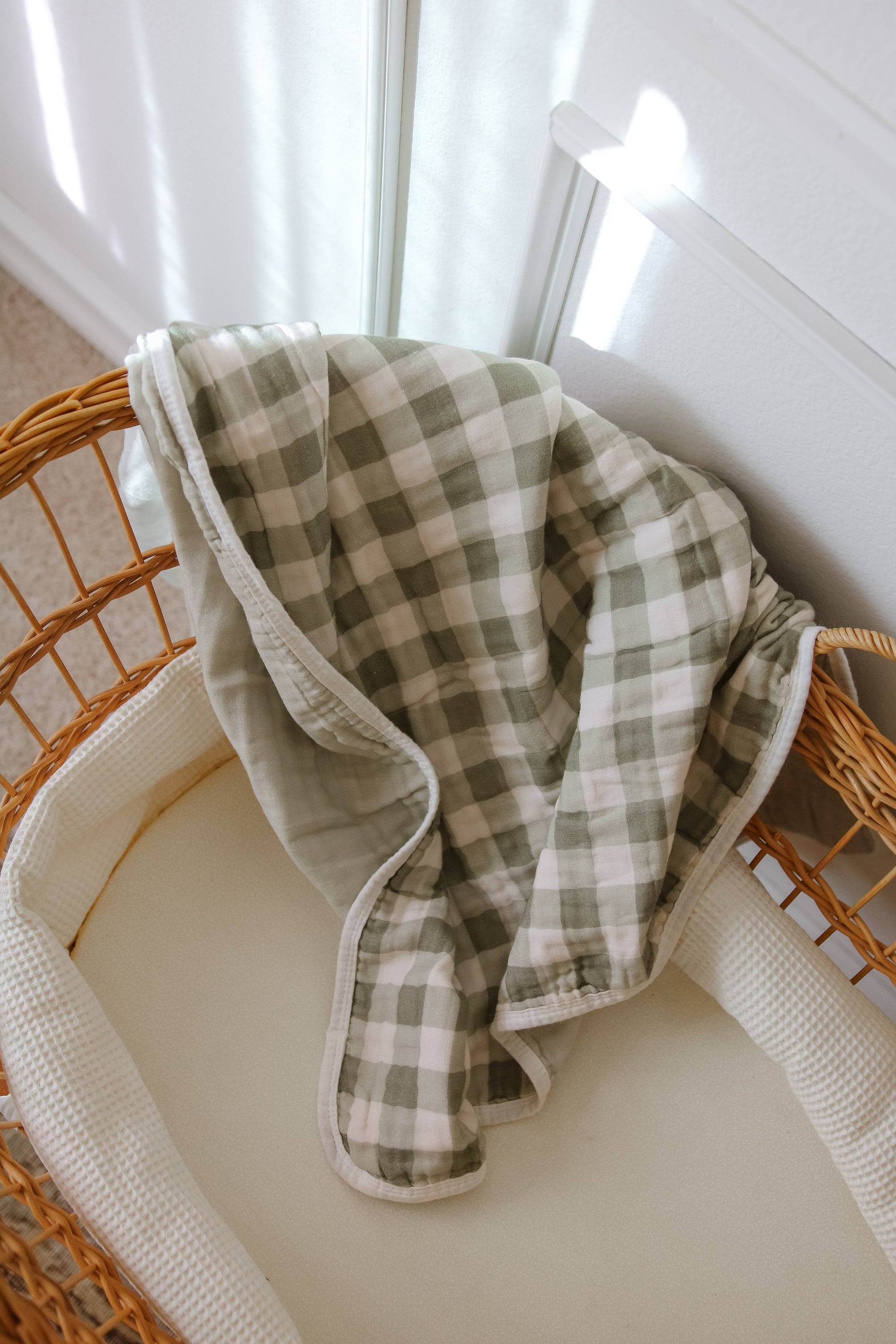 These beautiful blankets are made of a soft 6 layer gauze and feature a white trim. They measure 45 x 45in giving your little ones a lot of room to grow with their new blankets. Perfect from birth, toddlerhood and beyond. They also make a great lap blanket for you too! MATERIAL: 100% Cotton 6 Layer Gauze. The pillowy texture will occur with washing and drying. If you like a flatter look, you may lay flat or hang to dry. MEASUREMENTS: 45 x 45in COLORS: Features a vintage green and cream gingham with a coordinating green backing. Edging is a plain white edge. CARE: Wash on cold, gentle cycle. Tumble try low for the pillowy, crinkle texture. Lay flat or hang to dry for smoother look.