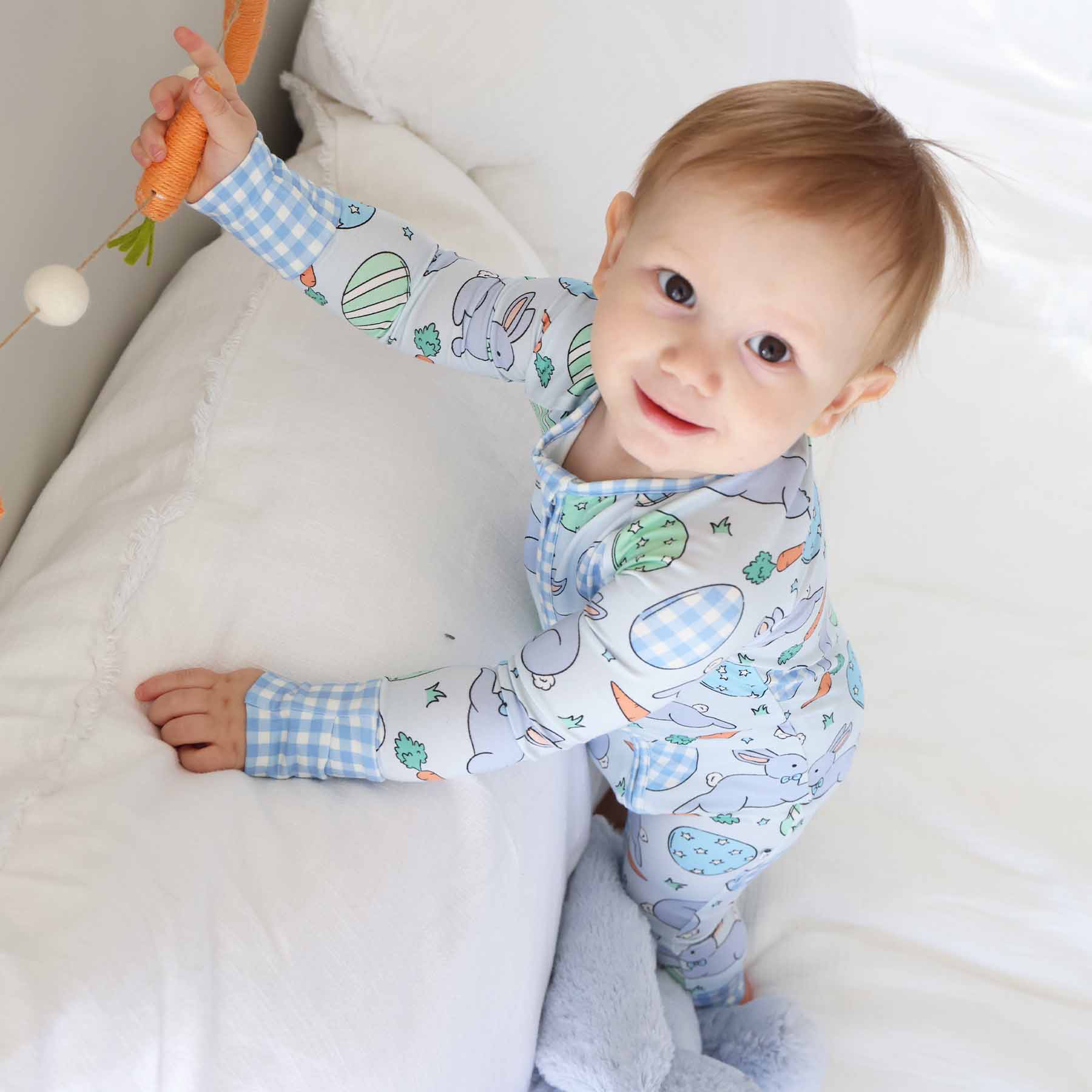 Hop into bedtime sweetness this Easter our Hoppy Spring convertible zip romper! Designed with bunnies, Easter eggs, and carrots, this one-piece is made for cozy nights, early-morning cuddles, and all the springtime lounging in between. Crafted from ultra-soft, stretchy bamboo fabric, this romper keeps little ones comfy all night long. The convertible cuffs let you switch between footed and footless wear, making it perfect fo