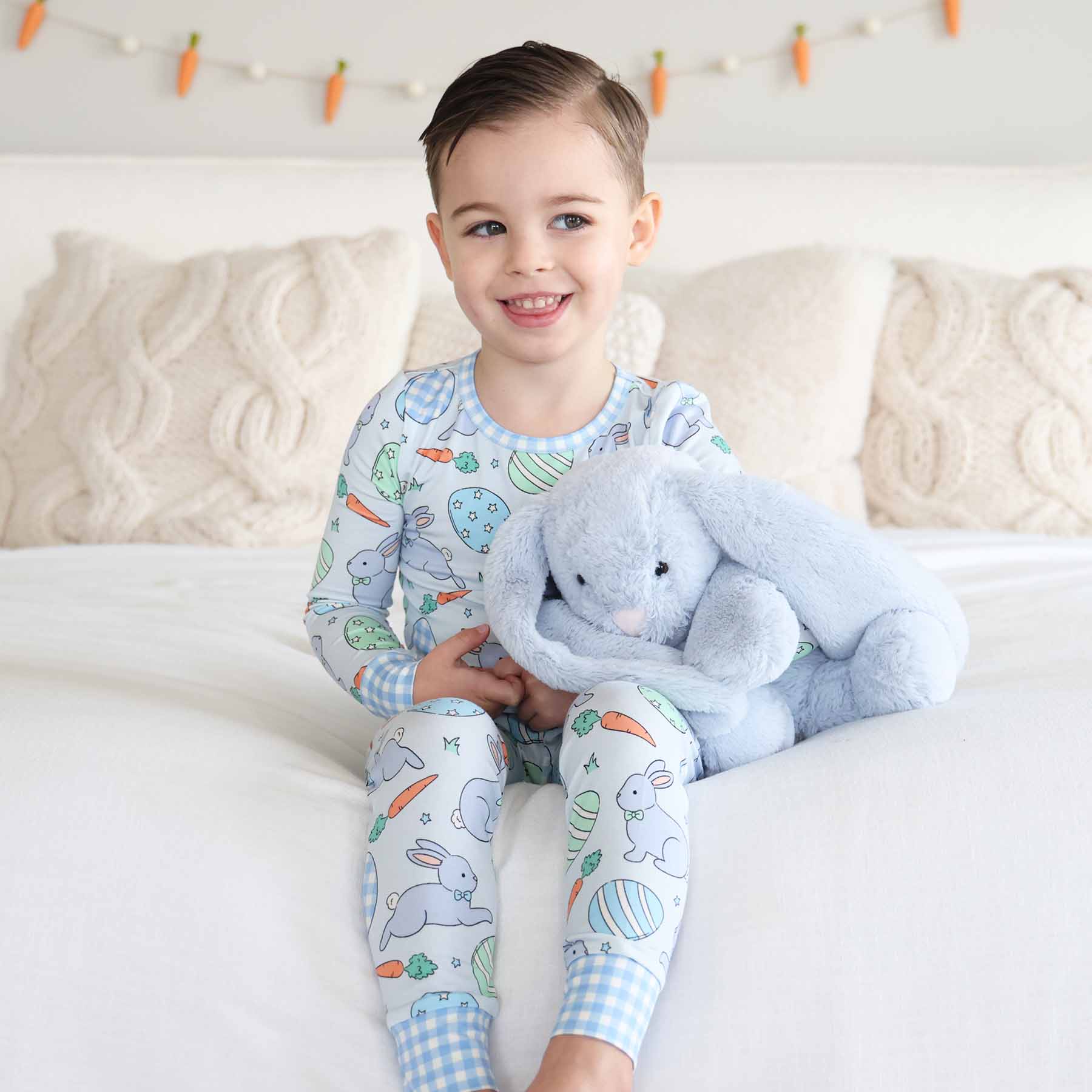 Hop into cozy nights and cheerful mornings with the Hoppy Spring two piece pajama set! Covered in playful bunnies, Easter eggs, and carrots, this festive print is perfect for celebrating Easter and all the sweet moments that come with spring. Made from ultra-soft, stretchy bamboo fabric, this two piece set is designed to keep kids comfy from bedtime to breakfast. The easy pull-on pants and relaxed fit top make it perfect for growing kids who love to move, lounge, and snuggle. Lightweight and bre