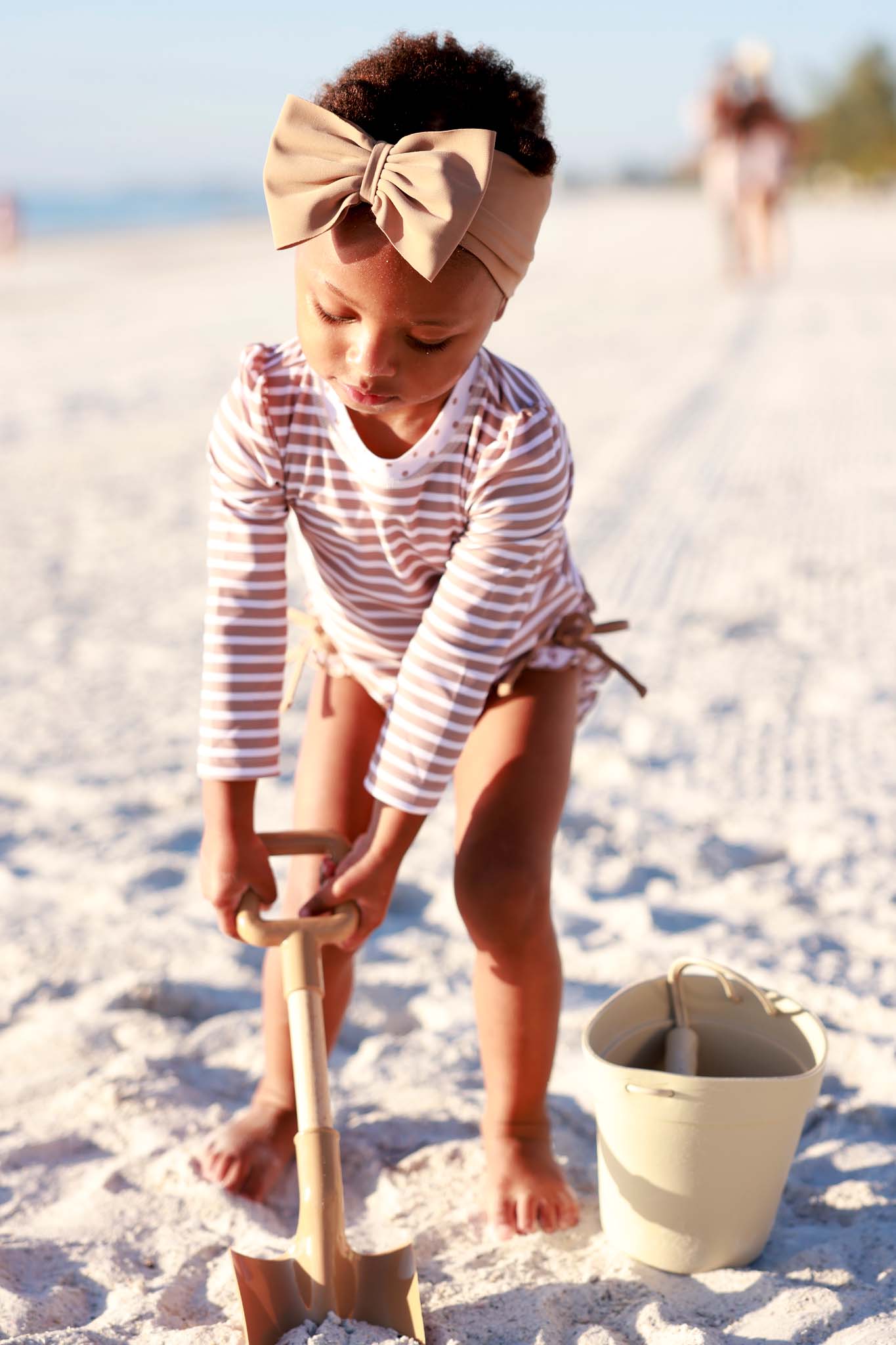 Sweet, sandy, and made for matching moments! The Sandy Stripes Long Sleeve Rash Guard with Ruffle Bottom is part of our family matching swim collection, so everyone can coordinate for beach days, pool days, and every sun-soaked memory in between. With neutral stripes and playful polka dot accents, it’s the kind of print that looks adorable on littles and still feels timeless for the whole family. This one-piece style is made from UPF 50+ fabric to help keep her covered while she plays in the sun, and the ruffle bottom adds the cutest little detail that is adorabl