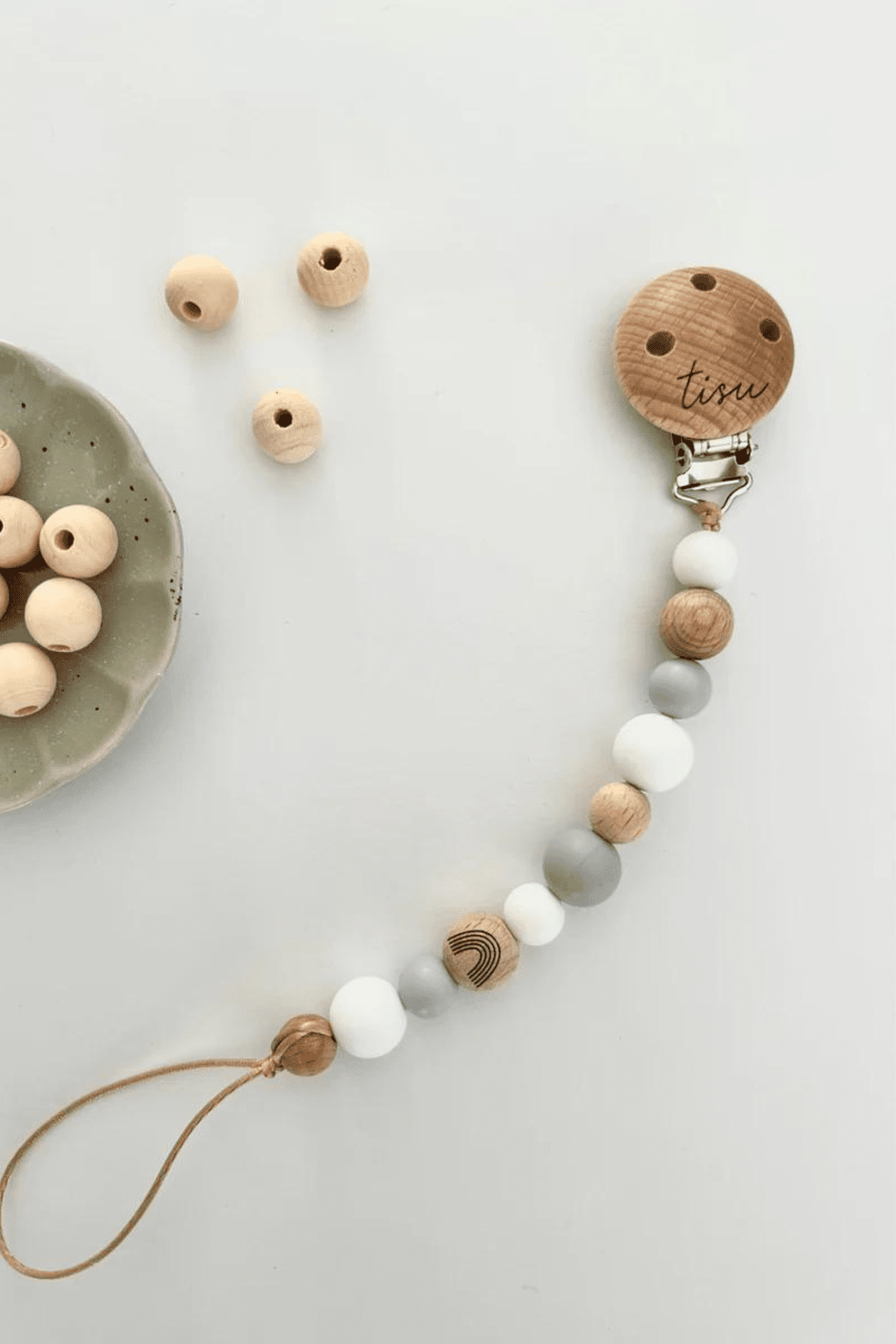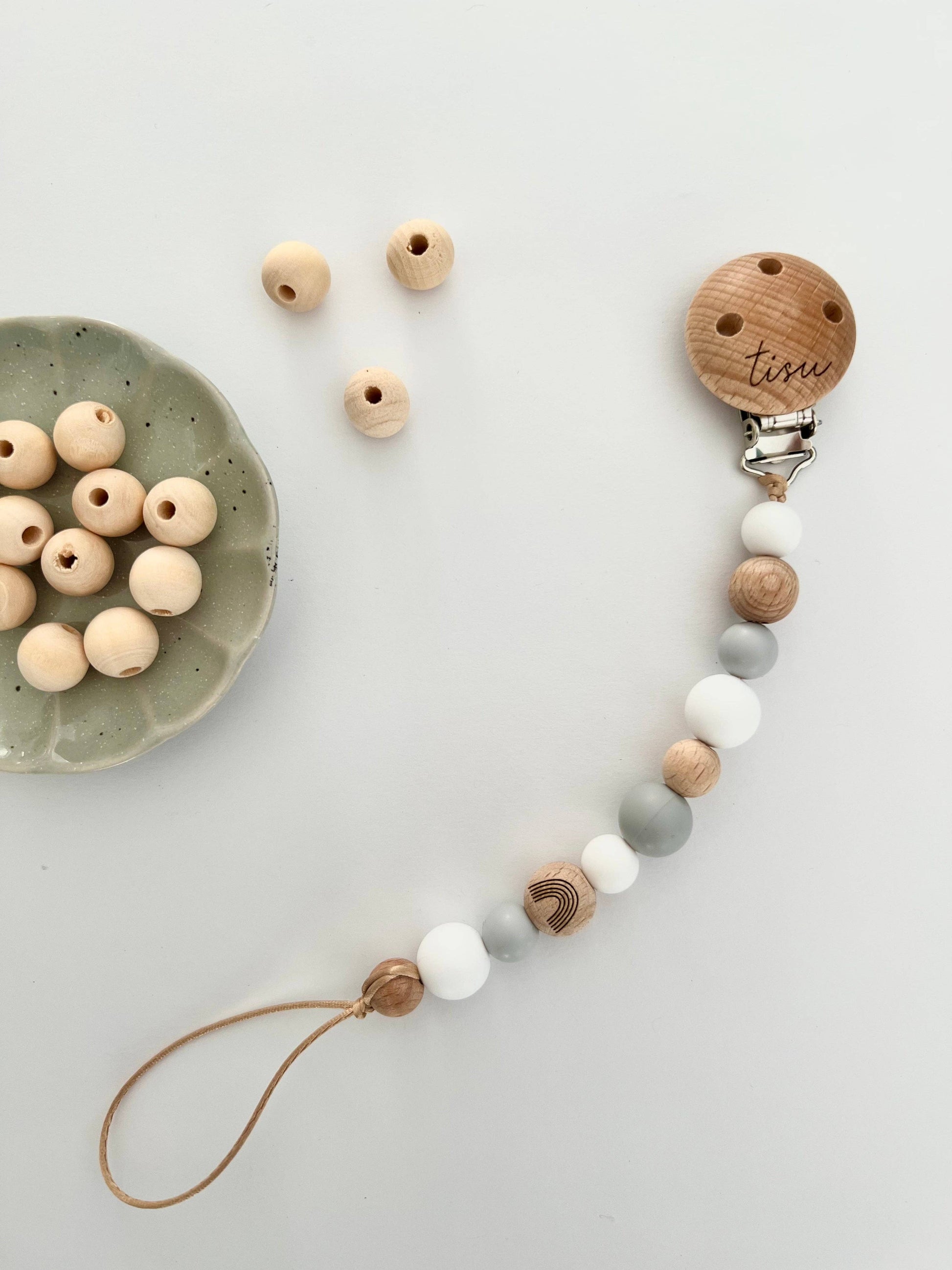 Beautiful TISU Pacifier Clip keeps your baby's pacifierĀ safe and clean! š¶š» Details: * Suitable with all pacifier models! * Handmade * Silicone beads are made of premium quality 100% food grade silicone. Wooden beads are natural and eco friendly. * TISU Pacifier Clips are made to European childrenās safety standards * Warning: This is not a toy. It contains small parts and they can be dangerous for small children, so do not leave a child unattended with a pacifier. Please test the durability of the product from time to time and never give a broken product to a child. Before each use, check the whole soother holder. Throw away at the first sign of weakness or damage.