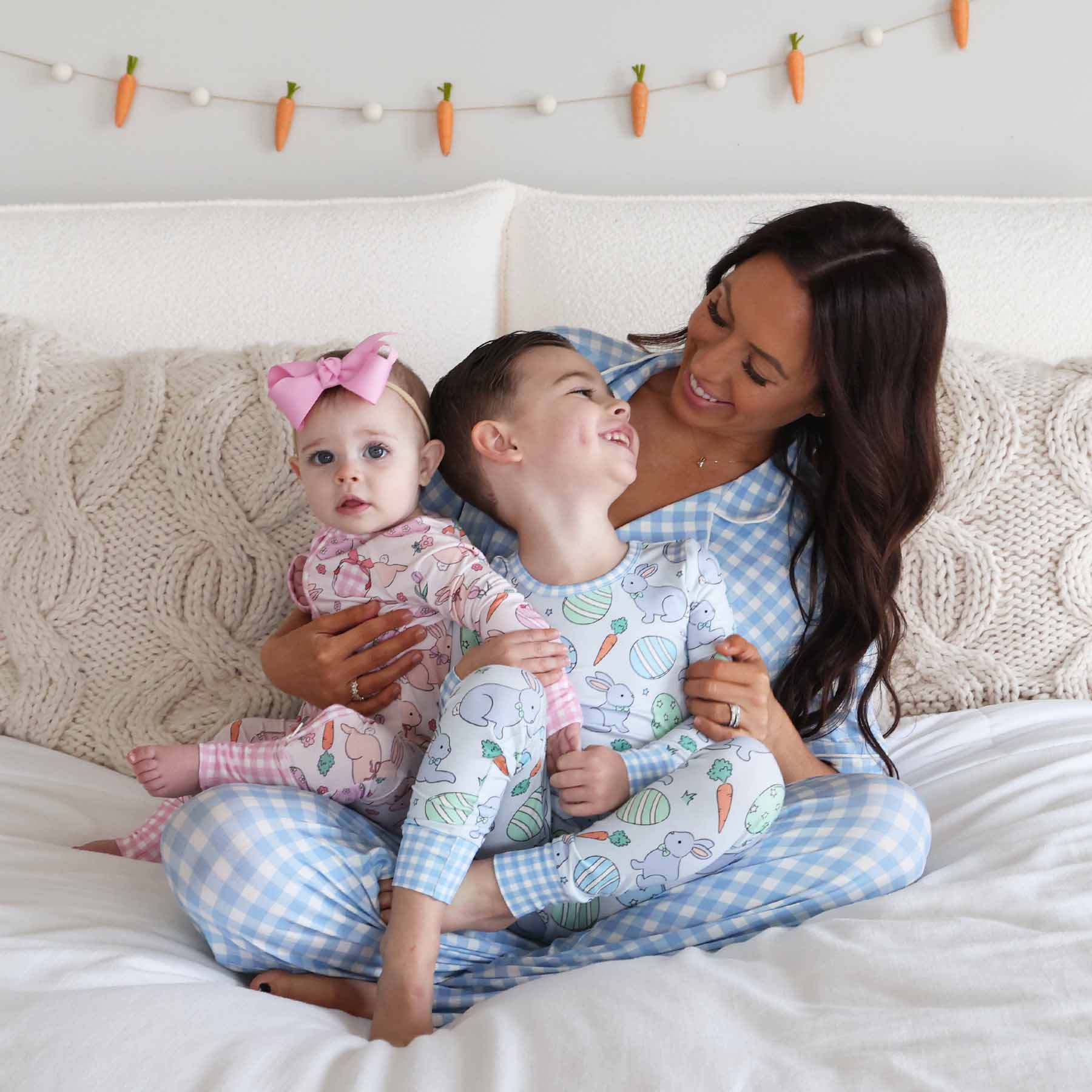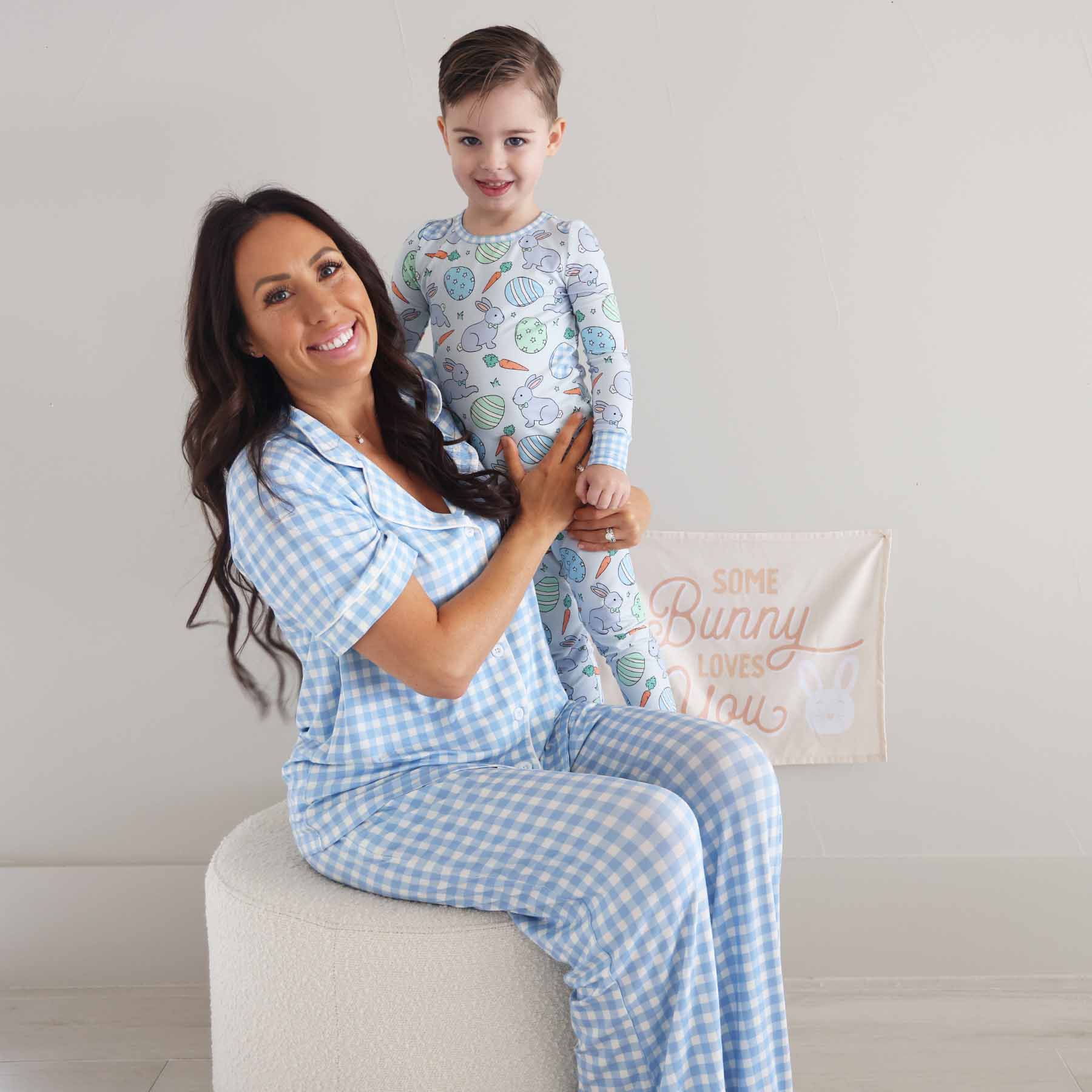 Soft, timeless, and made for spring days, the blue gingham flare lounge set for moms is the perfect blend of comfort and style for the Easter season. Designed with a classic blue gingham print, this short sleeve set is ideal for slow mornings, family gatherings, and sweet matching moments with your little one. Crafted from buttery-soft bamboo fabric, it’s lightweight, breathable, and incredibly comfortable to wear all day. The relaxed short sleeve top pairs effortlessly with the flared pants, creating a flattering silhouette that feels easy and put-together. Whether you’re hosting Easter brunch, relaxing at home, or